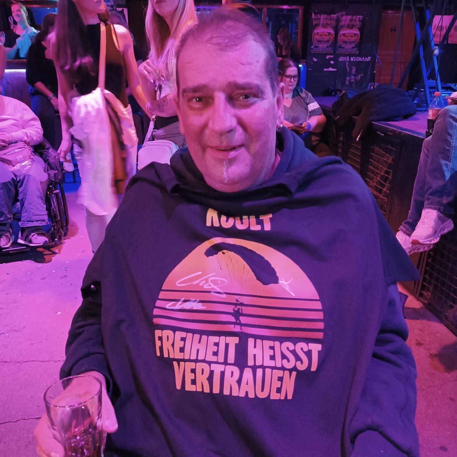 Gut gestärkt ging es zurück zu unserem Wünschewagen, der uns ins legendäre Riders Café brachte. Dort wurden wir schon vom Inhaber erwartet, denn für Rigo und seine Frau sowie uns Begleitende sollte der Einlass vor dem offiziellen Publikum stattfinden. Als Überraschung gab es nämlich noch ein kleines Zusammentreffen mit dem Sänger der Band Kuult! Die Texte der Lieder hatten die beiden durch die schwersten Zeiten gebracht, als unklar war, wie und ob Rigo auf der Intensivstation überleben würde. Es war ein großer Herzenswunsch, gemeinsam das Konzert zu erleben, denn nach fast 30 Jahren Beziehung hatten sie noch nie ein Konzert gemeinsam besucht.