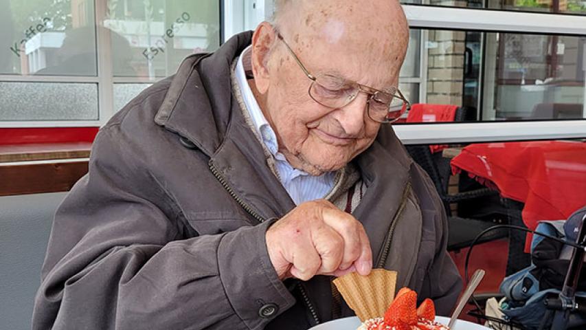 Im Anschluss gab es noch ein Spaghettieis mit frischen Erdbeeren im Stamm-Eiscafé. Keiner hätte geglaubt, dass ein einziger Mensch so viel Eis essen würde, doch Herr H. löffelte die riesige Portion bis auf den letzten Rest auf und sagte danach mit einem breiten Grinsen im Gesicht: „Na, ich denke, dass die Erdbeeren alle sind, ansonsten würd‘ ich mir direkt noch eins bestellen.“
