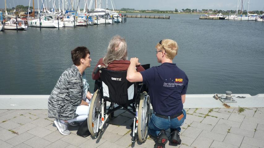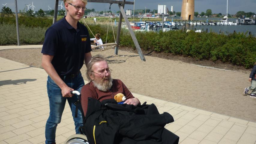 Gemeinsam mit seiner vertrauten Betreuerin und einem herzlichen „Ahoi!“ seinerseits machten wir uns auf den Weg, die lange Reise von Flensburg nach Fehmarn zu bestreiten. Und was soll man sagen, die Sonneninsel machte ihrem Namen mit blauem Himmel und strahlendem Sonnenschein alle Ehre. Schon aus weiter Ferne konnten wir die Fehmarnsundbrücke erkennen und schon durften wir Herrn P. in seiner alten Heimat willkommen heißen. Mit leuchtenden Augen gab er uns zu verstehen, dass er die ganzen Straßen wiedererkenne und sich an die alten Zeiten zurückerinnere. Als erstes Ziel steuerten wir sein damaliges Wohnhaus an, doch oh Schreck – von seinem Haus war nicht mehr viel zu sehen, stattdessen erblickten wir eine große Baustelle. Aber das sollte seine Stimmung nicht trüben, kurzerhand legten wir gemeinsam ein neues Ziel fest: Den zum Ortsteil Burgtiefe gehörenden Yachthafen. Vor Ort angekommen, erblickten wir an den Stegen Segelschiffe soweit das Auge reichte. Mit dem Herzkissen unterm Arm und dem Teddy „Wünschi“ sicher in der Kapuze seiner Regenjacke verstaut, ging es dann die Yachthafen-Promenade entlang, immer in greifbarer Nähe zum Ostseewasser. Sich gemeinsam über die Eindrücke auszutauschen, gehörte dabei ebenso dazu wie schweigend in den eigenen schönen Erinnerungen zu schwelgen. Dem glücklichen Lächeln unseres Fahrgastes nach zu urteilen schien er von diesen jede Menge parat zu haben.